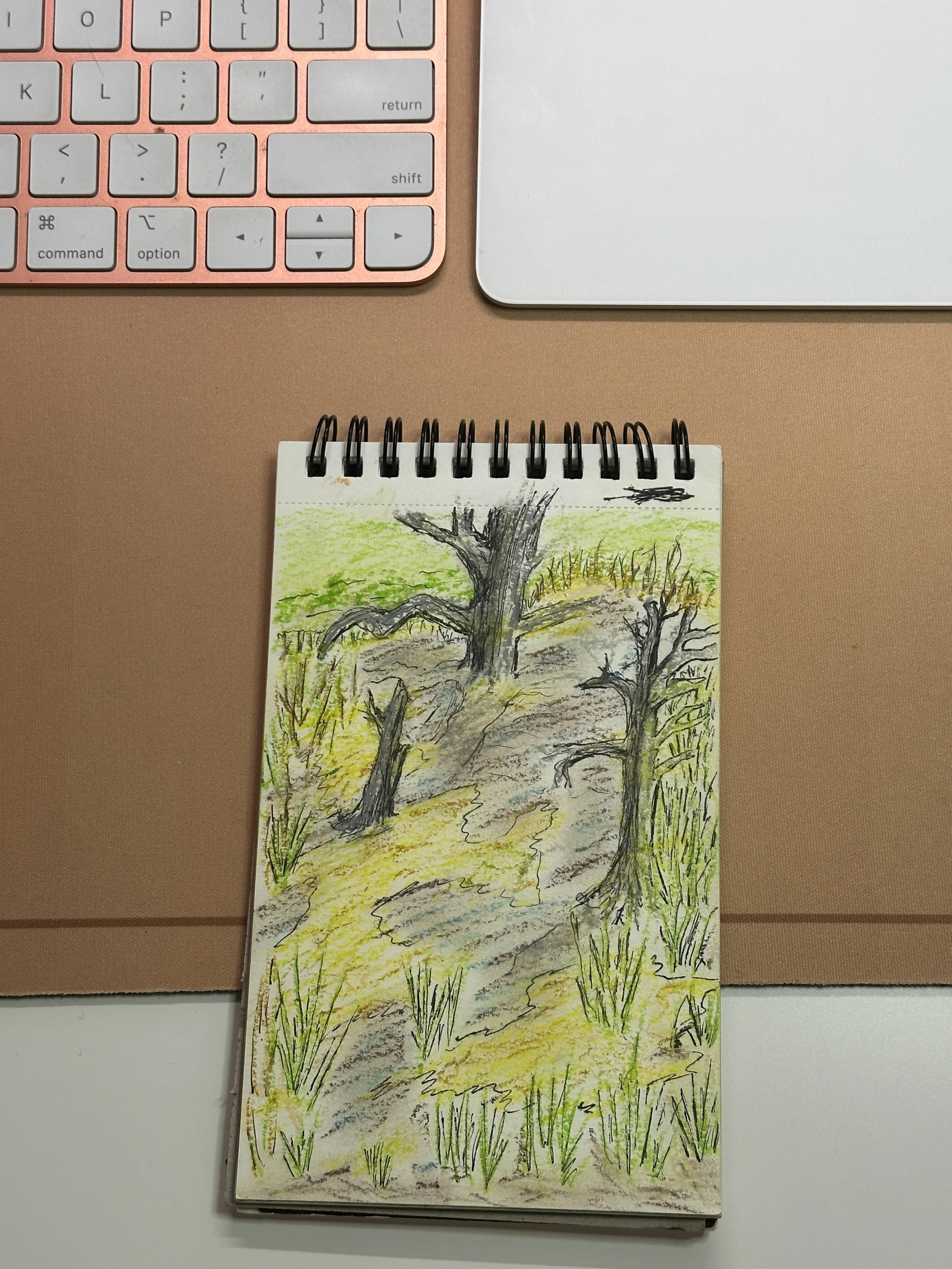 A 7-minute oil pastel and pen drawing I did at one of our “sit spots” during the hike. This one is of Frog Lake at Henry Coe.