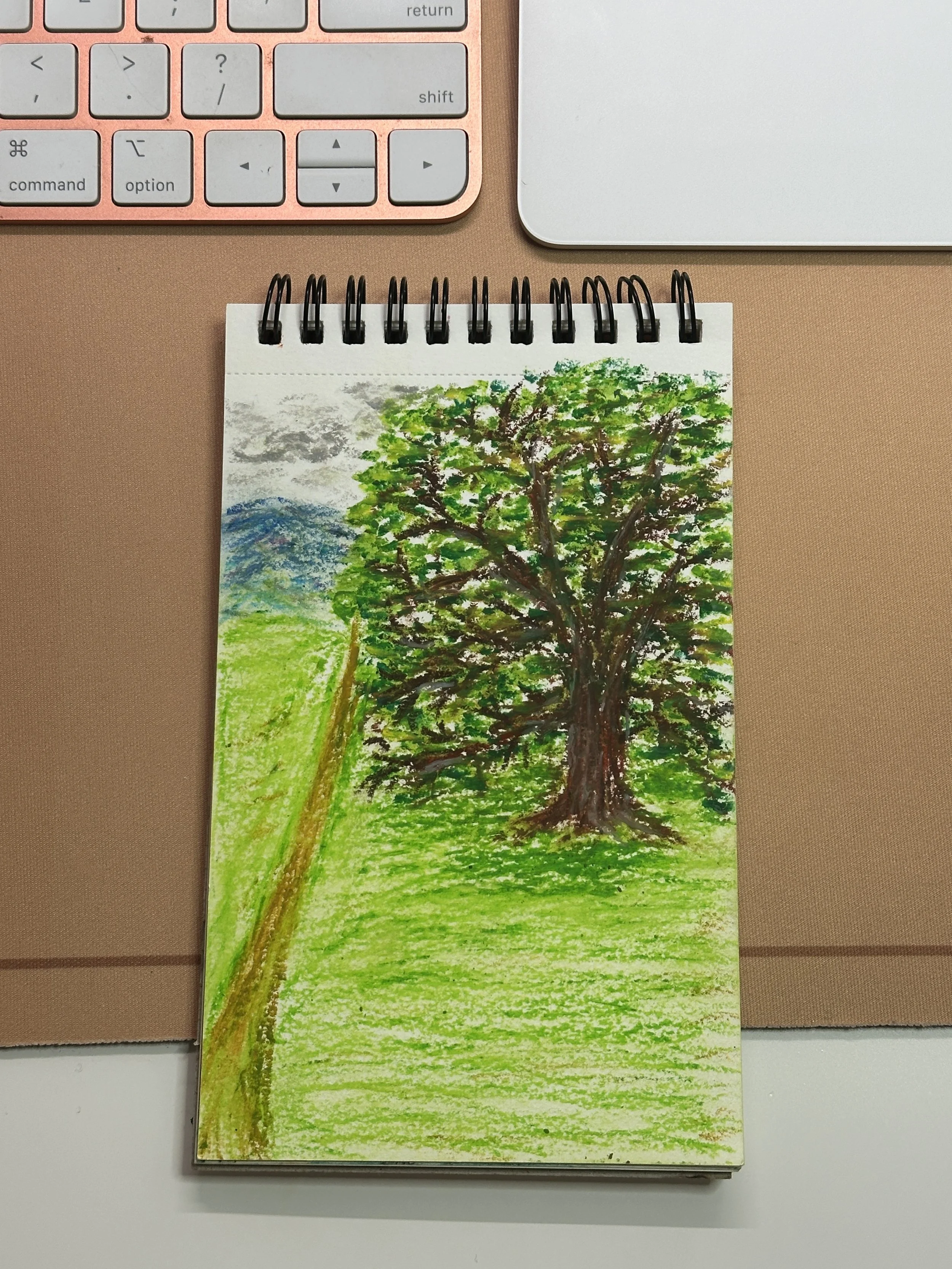 A 7-minute oil pastel drawing I did during one of our “sit spots” on the hike. This portrays a blue oak tree against the backdrop of hills and a cloudy sky.